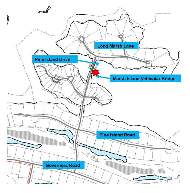Repairing and replacing the decking and railings on the Marsh Island vehicular bridge on Pine Island Drive is now scheduled to begin the week of July 8th. Weather permitting, project work is expected to take approximately 4 weeks. Once completed, the railings will be painted.