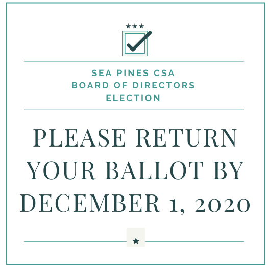 Sea Pines CSA Board of Director Election Ballots were mailed to eligible members on October 30, 2020. If you have not received your election ballot, you may request a replacement ballot package by emailing info@csaseapines.com and include your full name and Sea Pines property address.