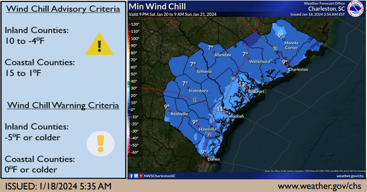 1/18/24 – From the Charleston National Weather Service: Arctic high pressure will produce very cold temperatures and hazardous wind chills during late Friday night/early morning Saturday through Monday.